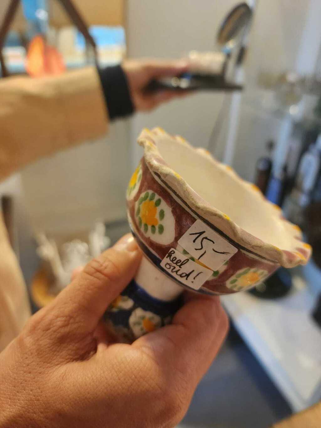 Este pote de cerâmica, com sua pintura artesanal, é uma obra de arte do século XIX. Encontrado em um antiquário em Bruges, Bélgica, ele carrega consigo a história e a tradição da cerâmica espanhola.