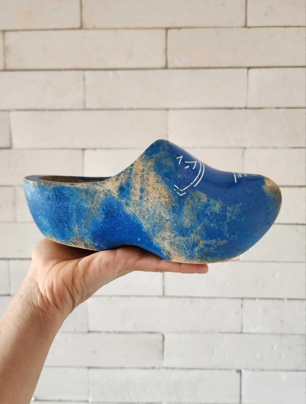 Descubra este par de tamancos holandeses, com um azul vibrante e patina do tempo. Feitos em madeira maciça, esses tamancos são uma verdadeira relíquia, encontrados em um antiquário em Bruges, Bélgica.